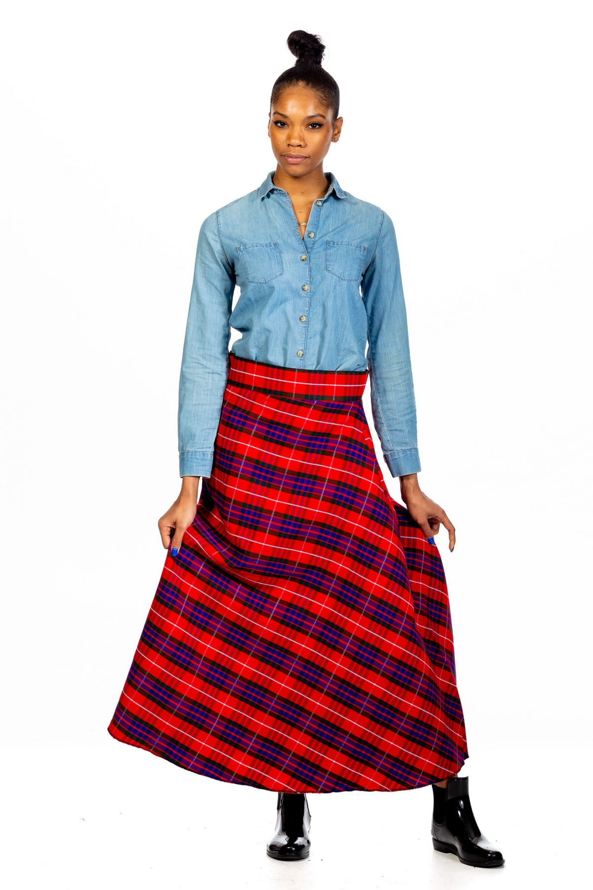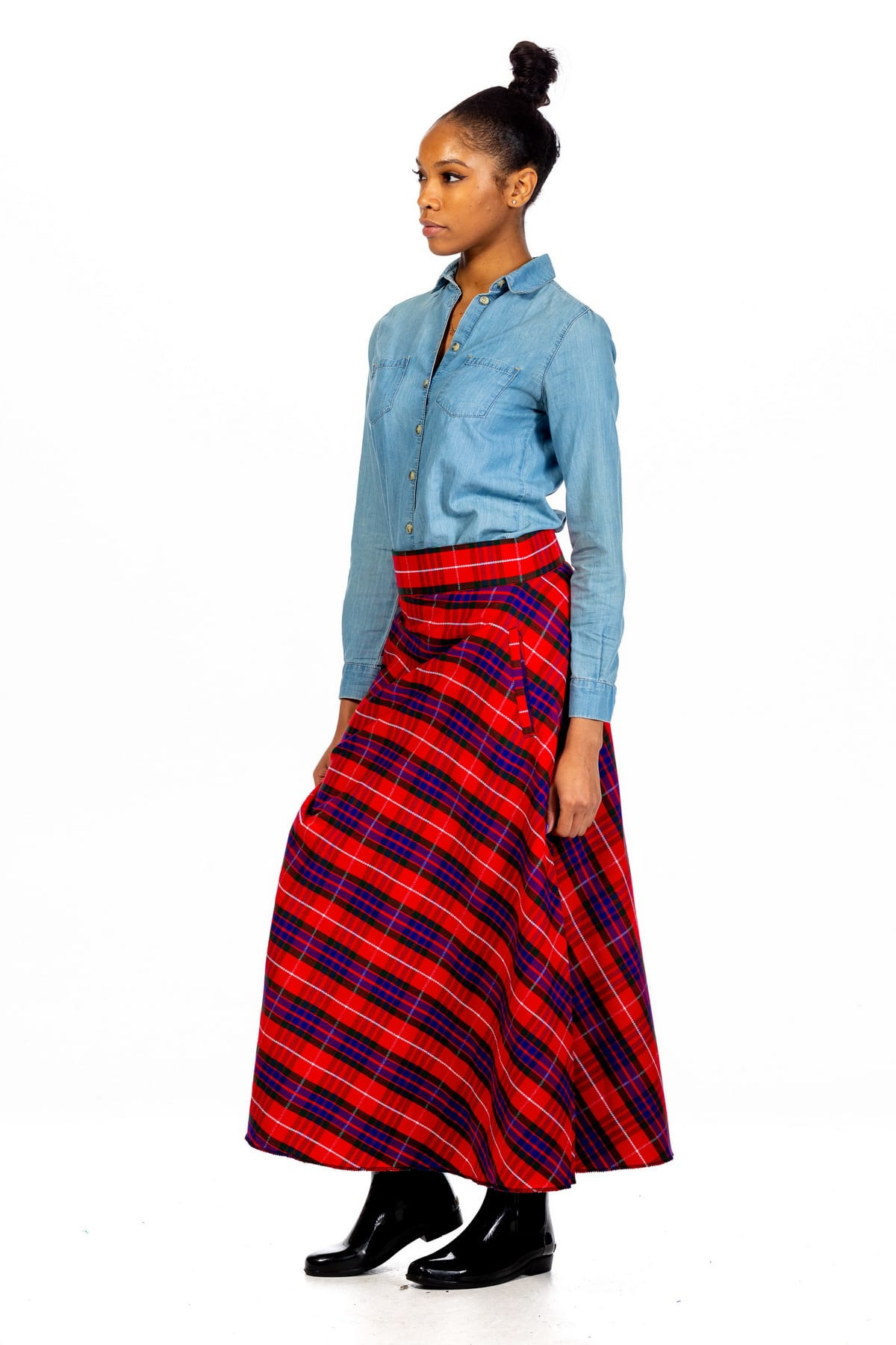 Design & Style: Timeless full-length maxi skirt with a pleated tartan plaid pattern.